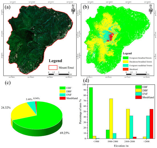 The mountain ecosystem is an important component of terrestrial ecosystems, with high levels of biodiversity, uniqueness, and resilience to environmental stress [1,2], and is a hotspot for international global change research. However, it is highly susceptible to climate change, land-use alteration, and human activities [3,4,5]. Mountain forest is essential in regulating global biogeochemical cycles [6] and preventing soil erosion to keep the environment stable [7]. Moreover, it is a crucial source of ecosystem services, including water and carbon storage [8,9], and provides essential habitats for some valuable wildlife species to facilitate their survival and reproduction [10]. Therefore, comprehending the distribution and characteristics of mountain forest types is imperative to better understand the ecological and climatic changes in the mountain ecosystem [11]. The mountain ecosystem is susceptible to vegetation diversity and distribution patterns. Variable topography and high altitudes result in different forest types and spatial distributions [12]. Traditional methods for surveying mountain forests rely on field investigation. In China, vegetation types were obtained by grouping plant communities of relatively similar structures. The forest types currently in use include: deciduous needleleaf forests, deciduous and evergreen needleleaf mixed forests (mixed forests dominated by deciduous and evergreen needleleaf trees where both deciduous and evergreen needleleaf have an importance value of less than 75%), evergreen needleleaf forests, needleleaf and broadleaf mixed forests (the plant community consists of a mixture of needleleaf and broadleaf trees; both needleleaf and broadleaf have an importance value of less than 75%; broadleaf trees include both deciduous and evergreen trees), deciduous broadleaf forests (mainly distributed in temperate and warm temperate regions and subtropical mountains), evergreen and deciduous broadleaf mixed forests (plant community consisting of a mixture of evergreen broadleaf trees and deciduous broadleaf trees; community types are extremely rich), evergreen broadleaf forests (distributed in the subtropical and humid north tropical mountains, and the sclerophyllous evergreen broadleaf forests are combined as a vegetation subtype in this vegetation type to reflect its ecological uniqueness), rainforests (distributed in the humid tropics; the plant community is composed of evergreen broadleaf trees with a height of more than 30 m), monsoon rainforests (distributed in areas with distinct wet and dry seasons under the influence of the tropical monsoon climate), mangrove forests (distributed in the tropical and neighbouring subtropical beaches, especially on salt marsh soils), and bamboo forests (the dominance of established species is usually very high, even in the form of pure forests) [13,14]. Although these methods and classification results provide a high accuracy, they are time-consuming, data-lagging, and pose challenges in rapid classification and periodic-change monitoring over large areas [15]. Remote sensing is a technique that employs various sensors to acquire information about the Earth’s surface and atmosphere from afar [16]. Vegetation classification based on remote sensing imagery involves interpreting satellite images and extracting vegetation information based on images’ colour, texture, tone, shape, and association information [17]. Compared to traditional field investigations, remote sensing can obtain information on forests across large and inaccessible areas without destroying the forest ecosystem [18]. It can be widely used to classify forest types and assess changes over time.