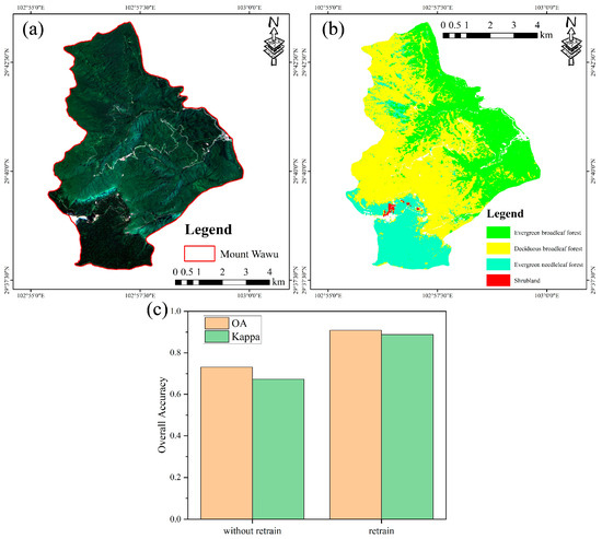 The model was first retrained using 80 sample plots (consisting of 30 EBF plots, 30 DBF plots, 12 ENF plots, and 8 shrubland plots) obtained from Mount Wawu. Then, we classified and mapped the forest types in that region, and the model’s accuracy was evaluated using the same assessment metrics mentioned before. As the field investigation data in Mount Wawu were scarce, the accuracy assessment was conducted by generating 600 random points and determining the forest type of each point through visual interpretation and the investigation data. We then calculated the OA and Kappa to evaluate the classification accuracy of the proposed model to see if the proposed 1D CNN could be transferred to different regions.