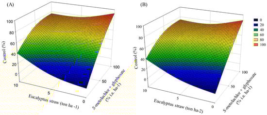 Surface response of the percentage of grass control at 43 days after sowing, under eucalyptus straw, application of S-metolachlor + glyphosate, and water depth of 25 (A) and 50 mm (B).