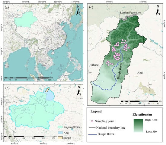 Study area: (a) Entire territory of China and its provinces; (b) Altai Mountain Burqin Forest region (China); (c) Sampling points.