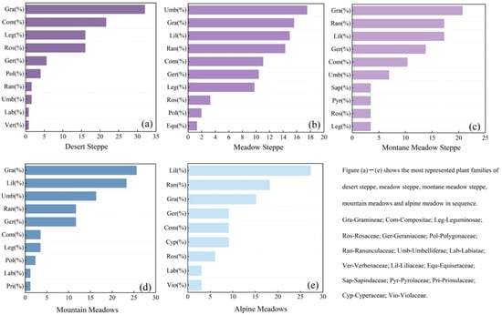 Gramineae, Liliaceae, and Umbelliferae were the dominant families in mountain meadows (MM), accounting for 24.4%, 22.2%, and 15.6% of the total, respectively. Liliaceae, Ranunculaceae, and Gramineae were the dominant families in alpine meadows (AM), accounting for 20.7%, 18.2%, and 15.2% of the total, respectively. In addition, Cyperaceae (which grows mostly in moistened soils) was present in alpine meadows, indicating that this grassland type has better water conditions.