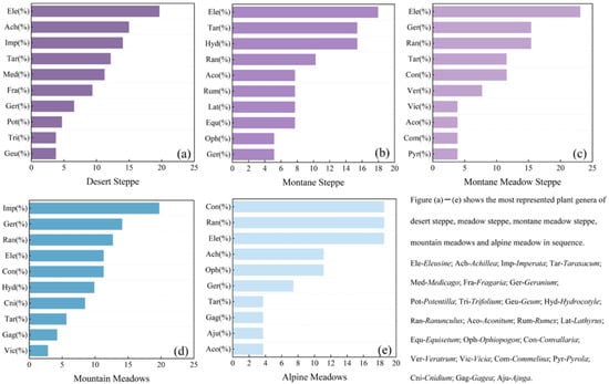 As can be seen in Figure 3, the dominant genera of grassland communities change and turnover with increasing elevation. In all grassland types, Eleusine is the main maintainer of ecological functions in grassland communities. However, its proportion in different grassland communities varied more significantly, and it was the most dominant genus in all grassland types, except MM and AM, where it accounted for only 8.9% of the total, and in MMS, where it accounted for 21.4% of the total. In DS, Achillea and Imperata were sub-dominant, accounting for 12.3% and 11.5% of the total, respectively. Multiple genera of Taraxacum, Medicago, Fragaria, Geranium, and Potentilla, among others, were also present. Achillea disappeared in the MS with increasing altitude, while Hydrocotyle and Ranunculus appeared with higher percentages—12.5% and 8.3%, respectively.