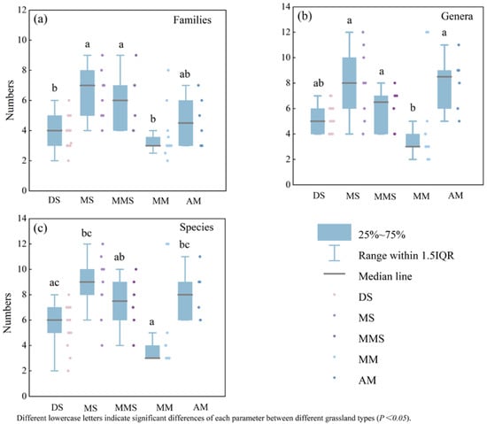 ANOVA between numbers of plant (a) families, (b) genera, and (c) species in grassland types in the Burqin region (China) (different lowercase letters indicate significant differences between the parameters in different grassland types).