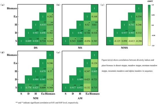 - In DS and MM, the Margalef, Simpson, Alatalo, and Shannon–Wiener indices determine the biomass, and the number of grassland species affects the biomass. The biomass of MS and AM was determined using the Simpson and Shannon–Wiener indices. The number of dominant species determines the biomass of MS and AM. The number of grasslands and the number of species do not have a significant impact on the biomass of MMS, which may be due to human factors such as grazing. The similarity in species composition between different grassland types is low.