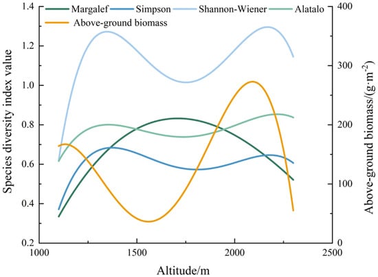 Figure 6 shows that above-ground biomass does not vary consistently with species diversity. The species diversity of different grassland types also varied significantly with increasing elevation. Changes in diversity indices for each species in the grassland community were generally consistent, except for Margalef, which showed a unimodal relationship with elevation (R2 = 0.61, p < 0.05). There was a 4-fold functional relationship with elevation, first increasing, then decreasing, and then increasing again. The peaks occurred at 1200–1400 m and 2100–2300 m above sea level. The peak in Margalef occurred at 1600–1900 m.