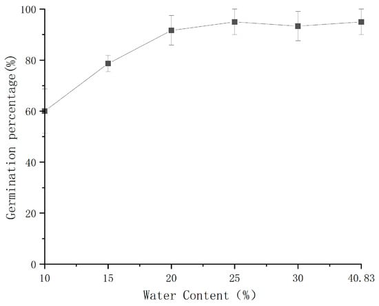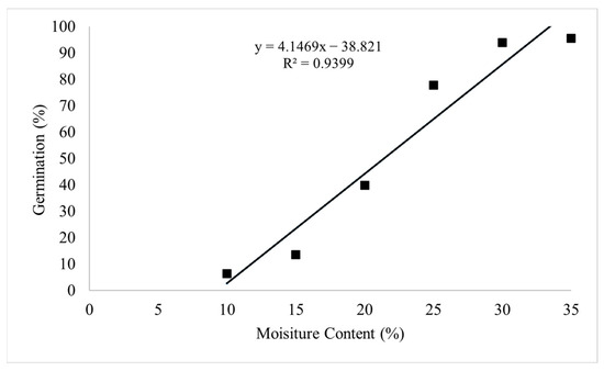 | Moisture Content (%) | Germination Percentage (%) | Germinability | Mean Germination Time (d) | Root Length (mm) | Number of Rotten Seeds |