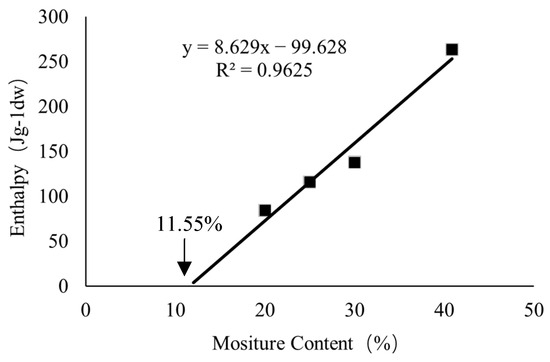 | Moisture Content (%) | Embryonic Axis Enthalpy (Jg-1dw) | Cotyledon Enthalpy (Jg-1dw) | Average Enthalpy of Cotyledons and Embryonic Axes (Jg-1dw) | ||||