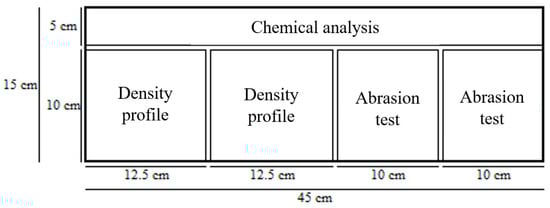The timbers were sawn into sixteen boards of 15 by 45 by 2.5 cm, conditioned in a climatization room (20 °C; 65%) to achieve a constant weight. Figure 1 presents the cutting scheme of the samples and the test blocks for the technological characterization.