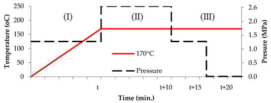 - Heating—initial temperature to treatment temperature (170 °C) and half of the full pressure (1.3 MPa);