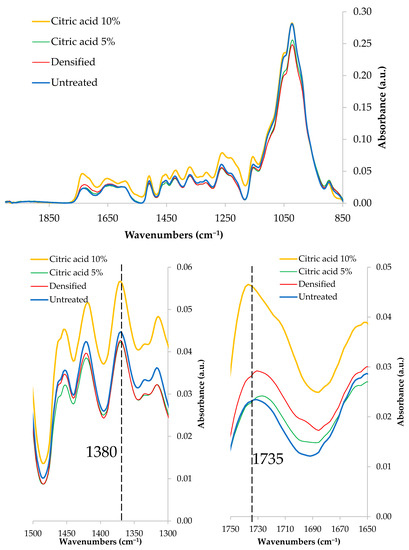 In this context, emphasis was given to two specific peaks: one between the 1725 cm−1 and 1740 cm−1 bands, related to the stretching of carbonyl groups (C=O) in the esters of wood polymers and citric acid [23], and the other one found in the 1374 cm−1 spectra, which, according to [24], is related to the polysaccharides (C-H bonds of CH3 groups) that are deformed in carbohydrates.