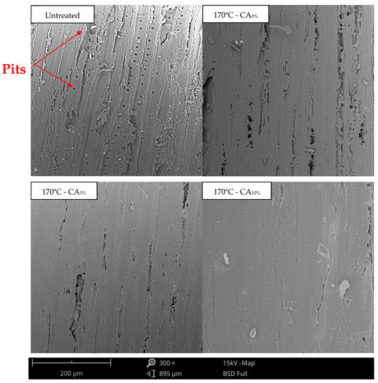 The result of the untreated samples corroborated with [27], who evaluated the microstructure of Pinus sylvestris sapwood and observed that it is a species with a very porous and irregular surface, with many apparent pits, characteristics that are typical of low-density pinewood.