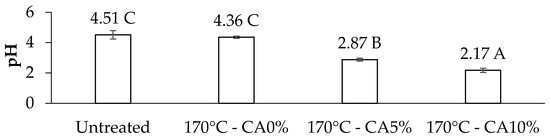 Lastly, the effect of citric acid corroborated with [32], who verified a reduction in the pH of Fagus sylvatica wood because of the application of citric acid. According to [33], such a reduction in pH observed in wood is the result of esterification reactions between the hydroxyls of the material and the carboxyls of citric acid, thus generating a new structure with a greater availability of protons.