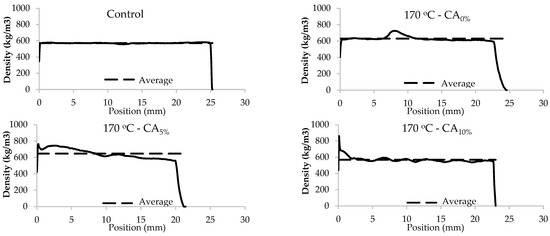 Lastly, the effect of citric acid corroborated with [13], who evaluated the effect of citric acid applied using an impregnation chamber on the density profile of sapwood of Pinus sylvestris and verified the formation of peaks next to the edge of the sample, suggesting a higher accumulation of the substance on the surface of the material.