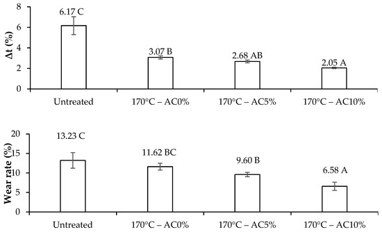 Figure 8 presents the abrasion (Δt) and wear rate (WR) of Pinus sylvestris for each treatment.
