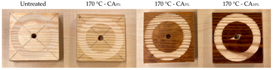 The application of CA was carried out using a paint roller to distribute the solution onto one of the surfaces and subsequent heating in an oven at 60 °C for 6 h, so that CA can react when adding functional chemical groups to the wood. The amount of CA applied was calculated by taking into account the mass surface volume of 450 by 150 mm (length × width) and 2.5 mm in depth. This resulted in average amounts of 0.0096 g/cm2 and 0.0191 g/cm2 for the concentrations of 5% and 10% of CA, respectively.