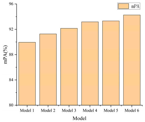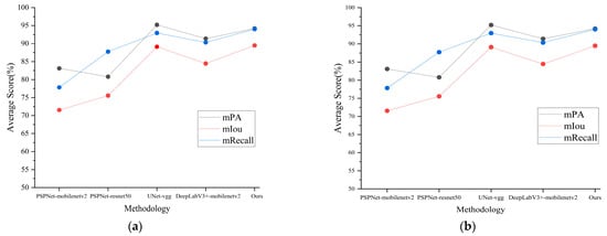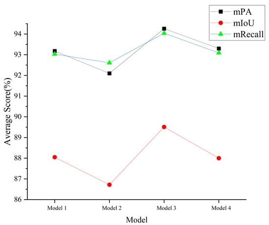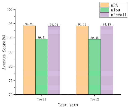 Figure 11 present the experimental findings. All models achieved high performance in terms of mPA, mIoU, and mRecall, with an average performance of 94.23%, 89.51%, and 94.04%, respectively. Furthermore, the model’s performance on the two test sets was not much different. This demonstrates the strong generalization performance of our model.