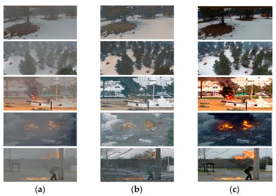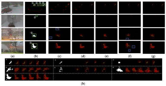 Figure 15a,b, most models had a little under-segmentation, except UNet-agg, DeepLabv3+, and our Defog DeepLabV3+. For small and hidden flames such as flame areas 2, 3, and 5, PSPNet could not correctly identify them. Image h of flame area 5 shows that DeepLabV3+ is not very fine-grained for flame edges. Both PSPNet and DeepLabV3+ have serious false detections (marked in blue boxes). Our model outperformed other segmentation models, especially on images with large haze and complex scenarios.