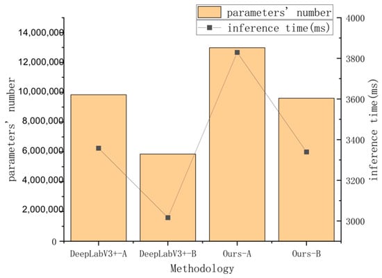 Figure 19, we can see that despite the increase in model size, the inference time of our improved model-B is almost the same as that of DeepLabV3+. This is because only the computation of the split branch is involved in the inference process. Therefore, the modest increase in computational overhead is worth the improvement in segmentation performance achieved by our proposed framework.