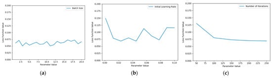 Figure 20. As we can see from the figure, the batch size fluctuated around 0.07 with a range of 0.01, the initial learning rate was between 0.07 and 0.15, and the number of iterations converged to 0.073. It can be observed that these three parameters had little sensitivity to the model performance.