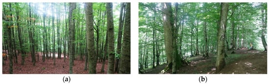 The mixed beech stands of study area. A view of selection cutting parcel (a) and of protected parcel (b).
