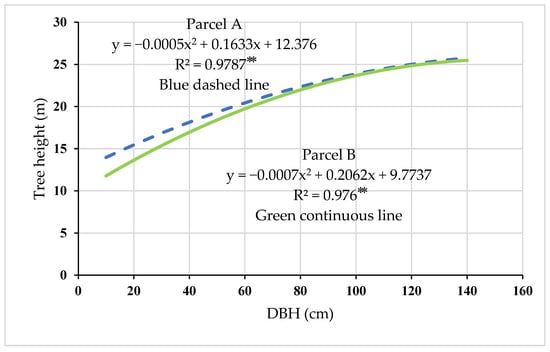 The tree height–DBH curves and regression analysis (Figure 4) indicated that there was a significant relationship (p < 0.01) between tree height and DBH. The height of trees increased with the increasing DBH of trees. In the same diameters, up to a DBH of about 80 cm, the height of the trees in parcel A was higher than that in parcel B. The height difference was greater in the small diameter classes; however, as trees’ DBH increased, the height difference between the two parcels decreased.