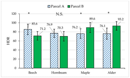 The results showed that the HDR value of beech trees in parcel A was significantly higher than that of parcel B, while the HDR value of maple and alder trees in parcel A was significantly lower than that of parcel B. There was no significant difference between the two parcels (Figure 6).
