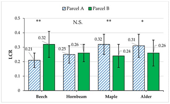 The LCR value of beech trees in parcel A was significantly lower than its value in parcel B, while the LCR value of maple and alder trees in parcel A was significantly higher than their values in parcel B. LCR of the hornbeam trees was not significantly different in the two parcels (Figure 7).