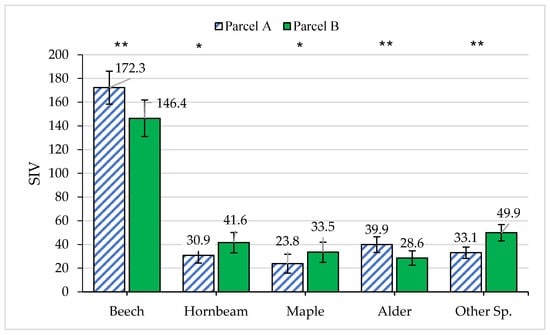 The average SCI in parcel A (0.89) was significantly lower than that of parcel B (1.30) (Table 4), while the SIV of beech and alder trees in parcel A was significantly higher than their respective SIV in parcel B, and the SIV of hornbeam, maple, and other tree species in parcel A was lower than their respective SIV in parcel B (Figure 8).