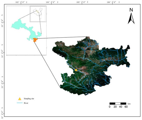 The study area (32°47′~33°42′ N, 104°34′~105°38′ E) is located in the vegetation restoration area along the Bailongjiang River in Longnan City, Gansu Province, China (Figure 1) at the confluence of the Qinba Mountains, the Tibetan Plateau, and the Loess Plateau, and the Bailongjiang River is a tributary of the upper reaches of the Yangtze River, the longest river in Asia [14]. It belongs to the transition zone from subtropical to warm temperate zones and is an important ecological barrier and water conservation area for the Yangtze River. In 2008, large-scale landslides occurred here, and the native vegetation was destroyed, creating bare soil. Under the administration of the local government, the villagers conducted extensive plantation activities on bare soil, by planting trees, shrubs, and grass. The multi-year average temperature is 14.9 °C with a mean annual precipitation between 400 and 900 mm. The soil type in this area is sandy loam [25]. The site descriptions and soil strength characteristics of the study area are summarized in Table 1.