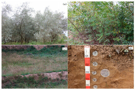 Field sampling was conducted from October to November 2019. The sampling site was located on a north-facing slope, 3.2 km long and 2.8 km2 in area. It was divided into three trial zones of 50 m × 30 m. The vegetation types in the test area are trees, shrubs, and grasses, as shown in Figure 2. We collected disturbed soil samples from each plot at a depth of 50 cm using soil pits. Undisturbed soil samples, such as bulk density samples, were collected at each depth using cylinders (10 cm in diameter, 500 cm3 in volume). A total of 108 soil samples were collected, with one half being disturbed soil samples and the other half were undisturbed soil samples (i.e., 3 vegetation types × 3 plots × 4 soil profiles × 3 repetitions).