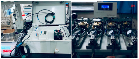 Figure 3. (a) Determination of SWCC using tensiometers. (b) Soil direct shear test using electric quadruple shear apparatus.