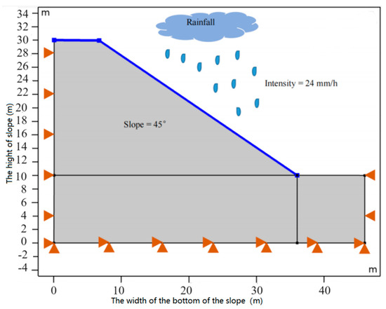 In the two-dimensional finite element model, the internal friction angle (φ) and cohesion (c) were reduced using the strength reduction method (SRM) and the maximum reduction factor was defined as the factor of safety (FoS = c/cr = tan φ/tan φr, where cr is the cohesion used in SRM and φr is the internal friction angle used in SRM). The SRM was applied to analyze the slope stability using COMSOL Multiphysics 5.6 (COMSOL Inc., Sweden). When FoS = 1, the slope stability is critical; when FoS > 1, the slope is stable; when FoS < 1, the slope fails [35]. The size of the geometric model used for the numerical simulation is shown in Figure 4, and the slope was 45°. The boundaries between the bottom and sides of the model were fixed constraint boundaries, the slant and top boundaries were rainfall infiltration boundaries, and the state of the slope was homogeneous. The corresponding material properties were set for slopes with different vegetation types, and the cohesion was defined as the sum of the cohesion provided by the cohesion of the bare soil and the contribution of matric suction. Only gravity loads were considered for the entire slope.