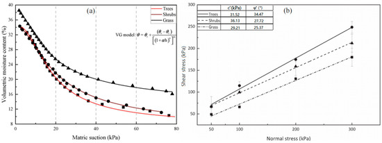 Figure 5. (a) Comparison of the SWCCs fitted with the Van Genuchten (VG) model for the three vegetation types (grass, shrubs, and trees). The red, brown, and black lines represent the best-fit line of the VG model in soils with trees, shrubs, and grass, respectively. (b) Relationship between shear strength at different normal stresses of soils with trees, shrubs, and grass.