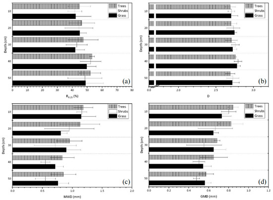 Stability analyses of soil aggregates are often expressed in terms of large aggregate content (soil particle diameter > 0.25 mm, R0.25), mean weight diameter (MWD), geometric mean diameter (GMD), and aggregate dimensionality coefficients (D), which are calculated using Equations (3)–(6). In soil hydromechanics, the composition of R0.25 (water-stable aggregate diameter > 0.25 mm) can be used to analyze the hydraulic stability of soil structure [37]. The greater the content of aggregates (>0.25 mm), the better the stability and distribution of soil aggregates [38]. Among the three vegetation types, the R0.25 of trees and stability of soil aggregates in trees were always greater than that of shrubs and grass (Figure 6a). The fractal dimension (D) of the soil aggregate structure reflects the influence of soil–water stability macroaggregate content on soil stability and structure [39]. The smaller the fractal dimension of the aggregates, the better the soil structure and stability (Figure 6b). The larger the aggregate mean weight (MWD) and geometric mean diameters (GMD), the better the soil structure and stability. The fractal dimension of aggregates shows that the soil with trees was smaller than that with shrubs and grass. However, the MWD and GMD of the soil with trees was larger than those of soil with shrubs and grass (Figure 6c,d). This suggests that the soil structure was most stable when trees were present; therefore, tree planting may reduce the fractal dimension of the soil structure and improve soil aggregate structure: