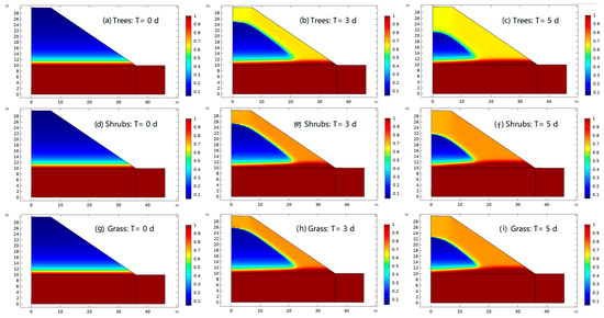 Figure 7. Effective saturation distribution of slopes at different times under rainfall conditions. (ac): trees; (df): shrubs; (gi): grass. Note: The size of the border indicates the scale size of the slope.