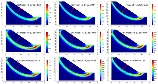 The soil mechanical strength parameters were obtained using the direct shear test, and the Van Genuchten model parameters were obtained from the SWCC [30]. These are provided in Table 1. Rainfall simulation for slopes with three vegetation types was performed using COMSOL Multiphysics 5.6 (COMSOL Inc., Sweden). From the distribution of the effective saturation of slopes after rainfall seen in Figure 7, the unsaturated area of the slope decreases with time after rainfall, with trees having the largest unsaturated zone relative to grass and shrubs, and the location of the diving surface being lower than the other two. The increase in the plastic strain represents the position of the critical failure surface and provides the possible failure mechanisms [40]. Figure 8 represents the plastic strain of the slope, with the red areas representing the areas of the greatest plastic strain, where the most severe damage occurred. We considered extreme rainfall conditions (480 mm/d) and different rainfall durations (t = 0 d, t = 5 d) to understand the impact of rainfall on slope stability. Under the mean rainfall intensity, seen from the cloud map (T = 0 d), the FoS of the slope with trees, shrubs, and grass was 2.22, 2.04, and 1.74, respectively. When t = 5 d, the FoS of the slopes of the three vegetation types was reduced. At this time, the FoS of the slope with trees, shrubs, and grass was 2.16, 1.94, and 1.64, respectively, and the FoS of trees decreased by 2.7%, shrubs by 4.9%, and grasses by 5.7%. The plastic zone indicates the potential sliding surface of the slope. The potential sliding surface depth of the slope with trees was smaller than that of the slopes with shrubs and grass.