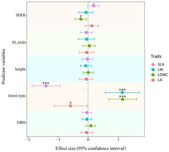 Relative influences of predictor variables on leaf traits of R. pseudoacacia individuals. The effect size was a standardised coefficient estimated separately for each predictor variable in the linear mixed-effects model. Statistical significance at different p-values is represented as: ‘***’ p < 0.001; ‘*’ p < 0.05; ‘.’ p < 0.1. SLA: specific leaf area; LA: leaf area; LDMC: leaf dry matter content; Lth: leaf thickness.