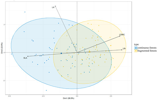 Principal component analysis (PCA) of intraspecific traits of R. pseudoacacia individuals. The yellow dots represent individuals in fragmented forest and the blue dots represent individuals in continuous forest. SLA: specific leaf area; LA: leaf area; LDMC: leaf dry matter content; Lth: leaf thickness.