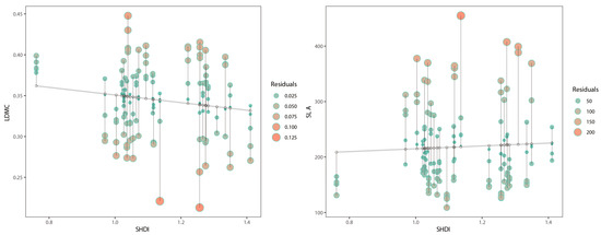Response of leaf traits to SHDI after linear mixed-effects model selection. Each bubble represents a R. pseudoacacia individual. In the residual analysis graphic, the colour gradient and bubble area size correspond to the absolute value of the residual, which was used to represent actual data points. The fitting data points were represented by small hollow circles and placed on a grey fitting curve. SLA: specific leaf area; LDMC: leaf dry matter content.