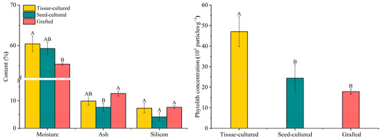 The phytolith concentration followed the order of tissue-cultured seedlings > seed-cultured seedlings > grafted seedlings, which was consistent with the variation in moisture (Figure 1). Silicon absorbed in the plant changed the permeability of plant tissues and affected the transpiration and water evaporation on the leaf surface [23,32,33]. The cell wall of phytoliths in plants also prevented plant cells from swelling and cracking due to excessive water absorption and stabilized the osmotic pressure of plant cells to a certain extent. Meanwhile, the water in phytoliths played a role in regulating water in plants [34]. In addition, phytoliths straightened the leaves, improved their photosynthetic efficiency [8], and helped sustain the normal photosynthesis and transpiration of plants under changing environments to alleviate plant stress [35]. Thus, silicon and phytoliths promoted water retention and regulated water use efficiency, photosynthesis, and transpiration, thereby improving the drought and high-temperature resistance of plants to some extent. The tissue-cultured seedling leaves had the highest phytolith concentration, possibly contributing to stronger drought and high-temperature resistance, whereas with the lowest phytolith concentration, the grafted seedlings might demonstrate weaker resistance to drought and high temperature.