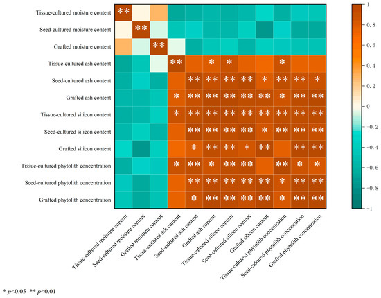 According to the correlation analysis, no significant correlation was found between the moisture and ash, silicon, and phytolith concentrations in D. brandisii leaves from different seedling raising methods (Figure 2). However, there was a highly significant positive correlation (p < 0.01) between the ash and silicon, as well as phytolith concentrations in leaves from seed-cultured and grafted seedlings (Figure 2). Moreover, a significant positive correlation (p < 0.05) was noted between the ash and silicon content, as well as the phytolith concentration for the tissue-cultured seedlings. Additionally, there was a highly significant positive correlation (p < 0.01) between the silicon and phytolith concentrations in D. brandisii leaves from different seedling raising methods.