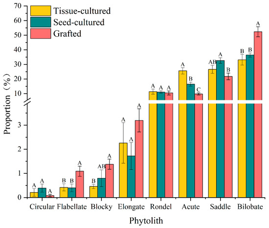 The proportion of rondel phytoliths was highest in tissue-cultured young leaves, followed by grafted and seed-cultured seedlings (Figure 4). With the growth of leaves, their proportion in different seedlings showed a decreasing trend, and a dramatic decrease was observed in tissue-cultured seedling leaves (Table 2).