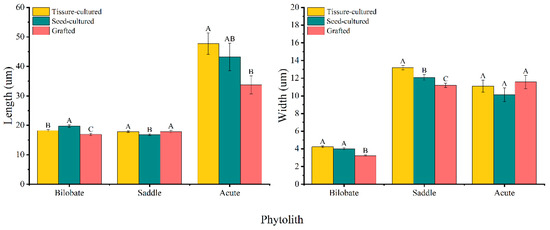 The mean length of the bilobate phytoliths varied in the order of seed-cultured seedlings > tissue-cultured seedlings > grafted seedlings, whereas the width varied in the order of tissue-cultured seedlings > seed-cultured seedlings > grafted seedlings (Figure 6). Both the length and width of the bilobate phytoliths in seed- and tissue-cultured seedling leaves were significantly greater than those in grafted seedling leaves (Figure 6). With leaf maturation, the bilobate phytolith size demonstrated an increasing trend, and the mature leaves of tissue-cultured seedlings had significantly longer bilobate phytoliths than those of young leaves (Table 3).