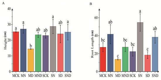 Plant physiological and ecological indicators. The bar above the column is Standard Error. (A) Plant height; (B) root length. Note: Different letters indicate significant differences between different treatment groups (p < 0.05). M: sterilization treatment; S: non-sterile treatment; CK: control group; N: nitrogen addition group; D: water deficit group; ND: water deficit, nitrogen addition group.