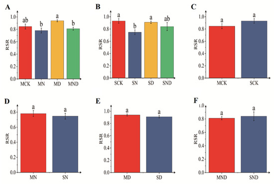 Root–shoot ratio of H. ammodendron seedlings. The bar above the column is Standard Error. (A) Root–shoot ratio of sterilization group; (B) Root–shoot ratio of non-sterile group; (C) Root–shoot ratio of sterilized non-sterilized control group; (D) Root–shoot ratio of sterilized non-sterilized nitrogen addition group; (E) Root–shoot ratio of sterilized non-sterilized water deficit group; (F) Root–shoot ratio of sterilized non-sterilized water deficit nitrogen addition group. Note: Different letters indicate significant differences between different treatment groups (p < 0.05). M: sterilization treatment; S: non-sterile treatment; CK: control group; N: nitrogen addition group; D: water deficit group; ND: water deficit, nitrogen addition group.