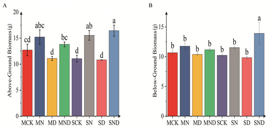 Displays the aboveground and belowground biomass of H. ammodendron seedlings. The bar above the column is Standard Error. (A) Above-ground biomass; (B) Below-ground biomass. Note: Different letters indicate significant differences between different treatment groups (p < 0.05). M: sterilization treatment; S: non-sterile treatment; CK: control group; N: nitrogen addition group; D: water deficit group; ND: water deficit, nitrogen addition group.