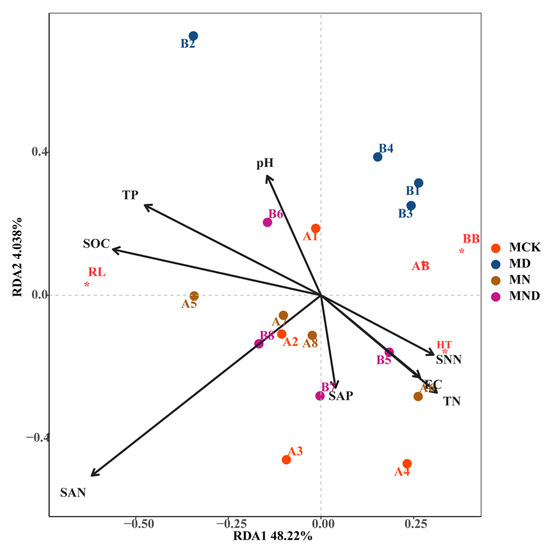 Under sterilization conditions, plant root length (RL) was strongly correlated with soil organic carbon (SOC) and total phosphorus (TP) and displayed a positive correlation with RDA1. Aboveground biomass (AB) and belowground biomass (BB) were negatively correlated with ammonium nitrogen (SAN) in RDA1 and RDA2. On the RDA1 axis, plant height (HT) was positively correlated with available phosphorus (SAP), electrical conductivity (EC), total nitrogen (TN), and nitrate nitrogen (SNN). Conversely, it displayed a negative correlation with ammonium nitrogen (Figure 4).