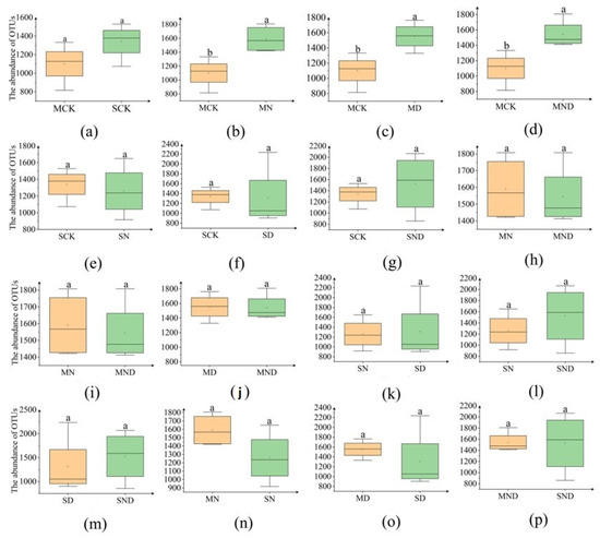 Bar plot of bacterial OTU numbers for different treatment groups. The bar above the column is Standard Error. (a) Sterilization control group vs. non-sterilization control group; (b) sterilization control group vs. sterilization nitrogen addition group; (c) sterilization control group vs. sterilization water deficit group; (d) sterilization control group vs. sterilization water deficit nitrogen addition group; (e) non-sterile control group vs. non-sterile nitrogen addition group; (f) non-sterile control group vs. non-sterile water deficit group; (g) non-sterile control group vs. non-sterile water deficit nitrogen addition group; (h) sterilized nitrogen addition group vs. sterilized water deficit nitrogen addition group; (i) sterilized nitrogen addition group vs. sterilized water deficit nitrogen addition group; (j) sterilization water deficit group vs. sterilization water deficit nitrogen addition group; (k) non-sterile nitrogen addition group vs. non-sterile water deficit group; (l) non-sterile nitrogen addition group vs. non-sterile water deficit nitrogen addition group; (m) non-sterile water deficit group vs. non-sterile water deficit nitrogen addition group; (n) sterilized nitrogen addition group vs. non-sterilized nitrogen addition group; (o) sterilized water deficit group vs. non-sterilized water deficit group; (p) sterilized water deficit nitrogen addition group vs. non-sterilized water deficit nitrogen addition group. Note: M: sterilization treatment; S: non-sterile treatment; CK: control group; n: nitrogen addition group; d: water deficit group; ND: water deficit, nitrogen addition group; different lowercase letters indicate significant differences between groups (p < 0.05).