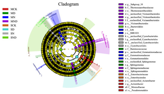 To analyze the specific taxonomic groups of bacteria in different treatment groups, linear discriminant analysis (LDA) effect size (LEfSe) difference analysis was performed to select biomarkers from the phylum to the genus level. The analysis showed that in the sterilization and non-sterilization treatment, each treatment group had characteristic biological species. These tended to be concentrated in Proteobacteria, Acidobacteria and Bacteroidetes. Under sterilized conditions, Gemmatimonadales and SBR1031 were significantly enriched in the nitrogen addition group (MN). In the nitrogen addition group (MND) under water deficit, sphingomonas, sulphurococcus, and thermoaerophilic bacteria were significantly enriched. Under non-sterile conditions, the enrichment of Pseudomonas in nitrogen addition group (N) was significant; in the water deficit nitrogen addition group (ND), cyanobacteria were significantly enriched (Figure 9).