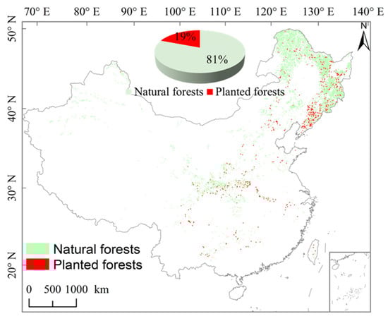The spatial pattern of natural and planted forests in China’s deciduous forest ecosystems. The inset shows the percentage of natural and planted forests in China’s deciduous forest ecosystems.